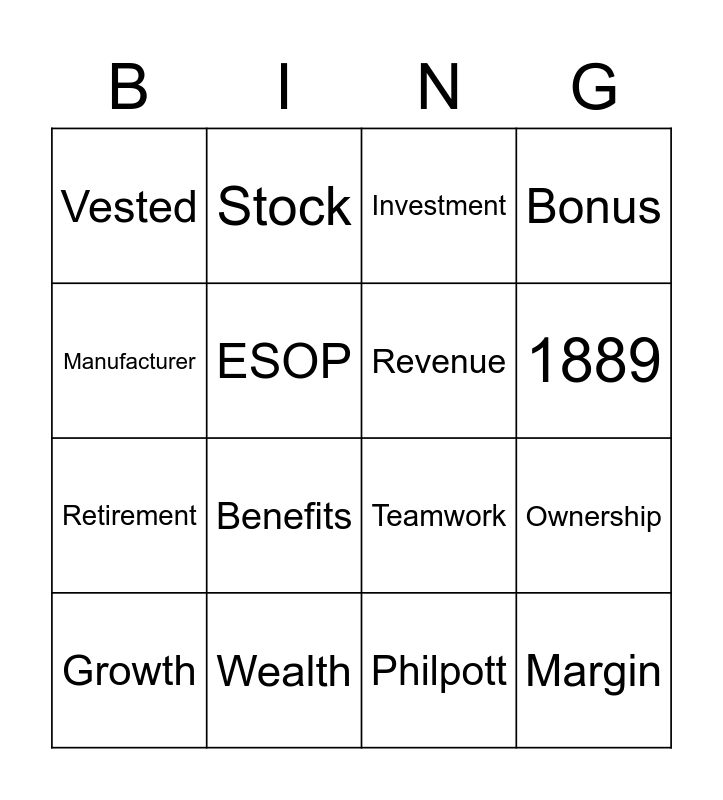 This bingo card has 16 words: Wealth, Ownership, Investment, Vested, Retirement, Stock, Teamwork, Philpott, Manufacturer, ESOP, Growth, Bonus, Benefits, 1889, Revenue and Margin.