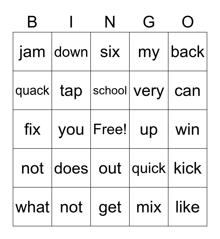 This bingo card has a free space and 24 words: does, not, school, what, back, jam, quack, down, up, out, very, fix, quick, kick, tap, mix, win, six, can, you, like, not, my and get.