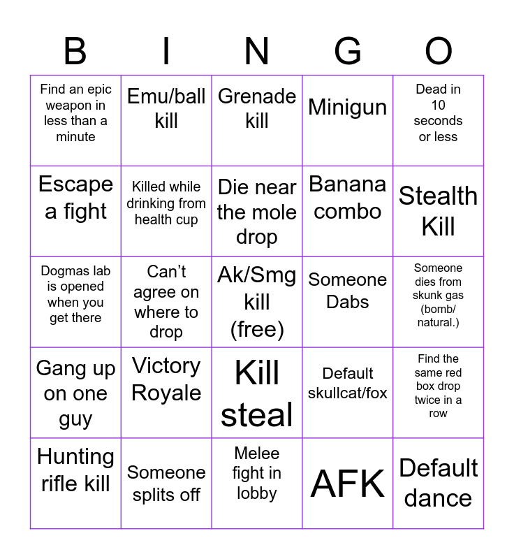 This bingo card has a free space and 24 words: Victory Royale, Someone splits off, Die near the mole drop, Hunting rifle kill, Dead in 10 seconds or less, Find an epic weapon in less than a minute, Escape a fight, Emu/ball kill, Someone Dabs, Kill steal, Banana combo, Dogmas lab is opened when you get there, Default skullcat/fox, Find the same red box drop twice in a row, Killed while drinking from health cup, AFK, Someone dies from skunk gas (bomb/ natural.), Grenade kill, Stealth Kill, Can’t agree on where to drop, Default dance, Gang up on one guy, Minigun and Melee fight in lobby.