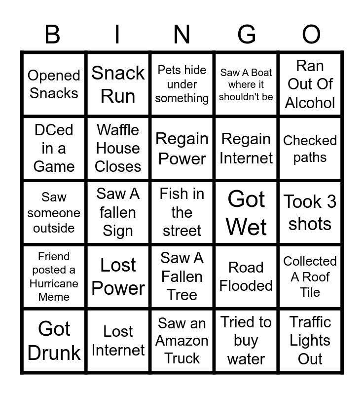 This bingo card has a free space and 24 words: Lost Power, Lost Internet, Regain Power, Got Drunk, Ran Out Of Alcohol, Opened Snacks, DCed in a Game, Snack Run, Got Wet, Saw A Fallen Tree, Regain Internet, Saw someone outside, Road Flooded, Collected A Roof Tile, Waffle House Closes, Tried to buy water, Took 3 shots, Pets hide under something, Checked paths, Saw A fallen Sign, Traffic Lights Out, Friend posted a Hurricane Meme, Saw A Boat where it shouldn't be and Saw an Amazon Truck.