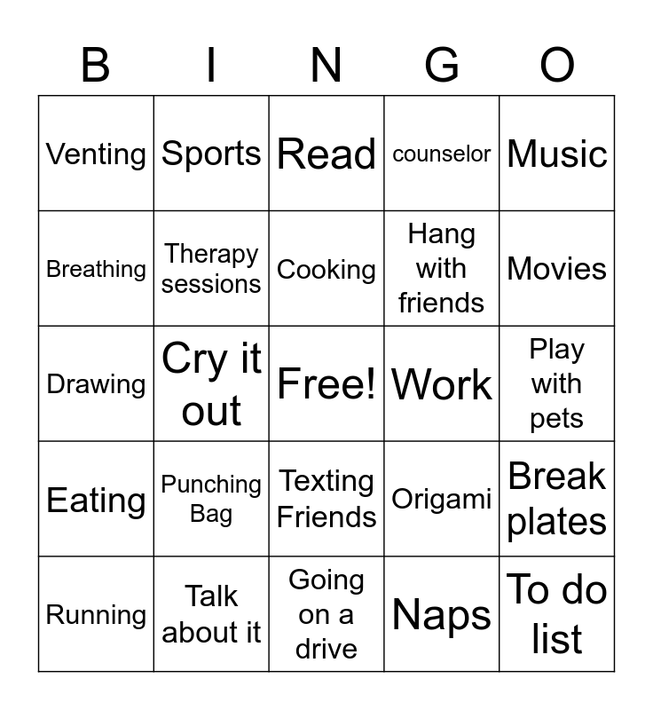 This bingo card has a free space and 24 words: Punching Bag, Talk about it, Cooking, Running, Music, Venting, Breathing, Sports, Work, Texting Friends, Hang with friends, Drawing, Origami, Break plates, Therapy sessions, Naps, Play with pets, Read, Movies, Cry it out, To do list, Eating, counselor and Going on a drive.