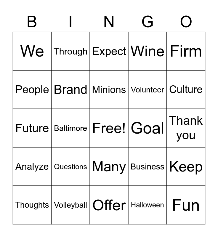 This bingo card has a free space and 122 words: Quality, Resources, Deliver, Improve, Quickly, Input, Through, Add, Offer, Agile, Recruiting, Related, Retention, Crucial, Strategy, Open, Thoughts, Pumpkin Spice, Cinnamon, Super-hero, Halloween, Minions, Everest, Lamar Jackson, Baby, Wine, Volleyball, Data, Understand, Challenge, Clients, Future, Analyze, Project Everest, Busy Season, Transformative, Collaborate, Leader, Assurance, Office, Flexible, Work, Time, Audit, Tax, Consulting, Technology, Continuous Improvement, Change, Baltimore, EY Ripples, Volunteer, Professional, Career, Welcome, Travel, Together, Fiscal Year, Important, Culture, Fun, Growth, Opportunity, Service, Public, Brand, Ahead, Thank you, Engage, Business, Goal, Expect, Pen, Smile, Like, Ethics, We, You, New, Available, Key, Keep, People, Ask, Why, Great, Able, Spend, Deeper, Communicate, Comfortable, Partner, Staff, Senior, Manager, Level, Recognize, Period, Sure, Many, Valuable, Project, Region, Represent, World, Firm, Focus, Something, Excited, Expand, Look, Develop, Super, Certainly, Questions, How, Effect, Different, Confident, Know, Minds and Overall.