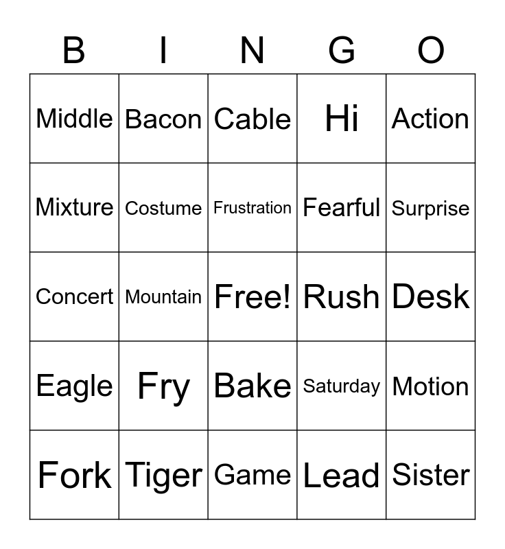 This bingo card has a free space and 24 words: Fry, Tiger, Frustration, Fork, Action, Middle, Mixture, Bacon, Rush, Bake, Fearful, Concert, Saturday, Motion, Costume, Lead, Desk, Cable, Surprise, Mountain, Sister, Eagle, Hi and Game.