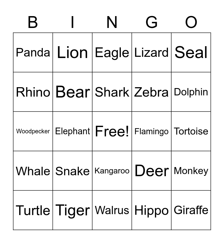This bingo card has a free space and 24 words: Snake, Tiger, Shark, Turtle, Seal, Panda, Rhino, Lion, Flamingo, Kangaroo, Zebra, Woodpecker, Deer, Monkey, Bear, Hippo, Tortoise, Eagle, Dolphin, Elephant, Giraffe, Whale, Lizard and Walrus.