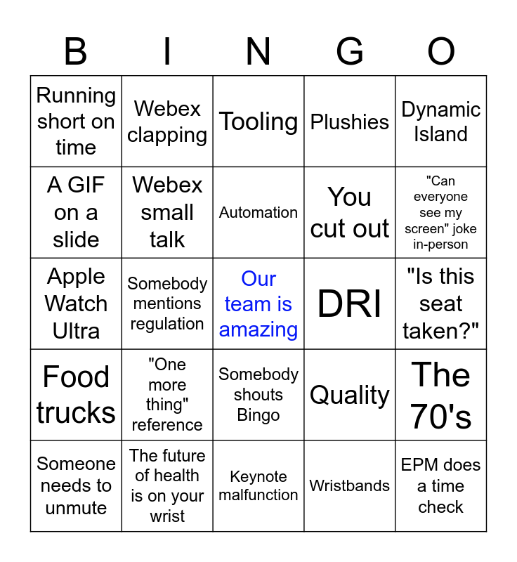 This bingo card has a free space and 56 words: Someone needs to mute, Someone needs to unmute, rdar://100000000, Running short on time, Keynote malfunction, 5+ seconds of awkward silence, Webex small talk, Webex fire react emoji, You cut out, Next slide please, Plushies, Someone named Chris talks, Cool Keynote animation, Non-awkward silence, Can everyone see my screen?, In-person conversation disrupting meeting, Dynamic Island, Somebody mentions regulation, I need coffee, EPM does a time check, DRI, Commute, Quality, Tooling, Somebody shares their entire screen, Automation, Someone called Matt talks, International Orange, "Can everyone see my screen" joke in-person, Someone brings up Star Wars, In-person clapping, The All-Hands comes up, Chef Krumb comes up, Sweet treats, "Is this seat taken?", A GIF on a slide, Apple Watch Ultra, Electric Car Chargers, Food trucks, Webex clapping, Somebody shouts Bingo, Salad line, Give N minutes back, Flexible work arrangements, Notification on shared screen, "One more thing" reference, The future of health is on your wrist, Birds of Paradise, Warrior, Someone mentions offline, Wristbands, Vending machines reference, Harry Potter, San Diego, The 70's and Privacy.