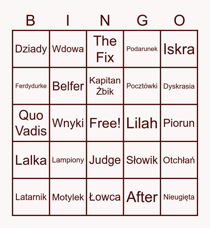 This bingo card has a free space and 75 words: Antygona, Lesio, Kapitan Żbik, Oczarowana, Płomień, Krzyżacy, Felix Net Nika, Monster, Szarada, Posłaniec, W pustyni i w puszczy, Bezcenny, Judge, Pocztówki, Uzdrowicielka, Ferdydurke, Motylek, Sherlock, Intryga, Dyskrasia, Pan Tadeusz, Wdowa, Łowca, Podarunek, Iskra, Mały Książę, Kruk, Torpedo, Royal, Przepowiednia, Zemsta, Obsesja, Lis, Słowik, Piorun, Dziady, Kukła, Dekalog, Lilah, Nieugięta, Ludzie bezdomni, Zimny Strach, The Dream, Zakupoholiczka, Achaja, Makbet, Wnyki, The Fix, Ku niebu, Lobelia, Inny Świat, Belfer, Szkielety, Siostry, Arkadia, Dżuma, Posiadłość, Trent, Rain, Zmierzch, Latarnik, Fetor, November, Pamiętnik, Widząca, Quo Vadis, Creep, Diuna, Promyczek, Otchłań, Lalka, Lampiony, Maus, After and Bożogrobie.