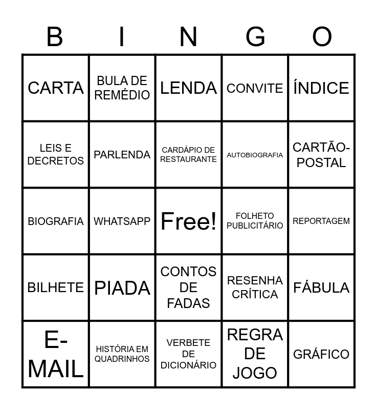This bingo card has a free space and 29 words: E-MAIL, DIÁRIO, WHATSAPP, RECEITA, CARTA, LENDA, PARLENDA, PIADA, FOLHETO PUBLICITÁRIO, HISTÓRIA EM QUADRINHOS, REPORTAGEM, GRÁFICO, VERBETE DE DICIONÁRIO, REGRA DE JOGO, CARTÃO-POSTAL, PEÇA TEATRAL, CONTOS DE FADAS, BILHETE, ÍNDICE, BIOGRAFIA, RESENHA CRÍTICA, DITADO OU PROVÉRBIO POPULAR, AUTOBIOGRAFIA, LEIS E DECRETOS, CONVITE, BULA DE REMÉDIO, FÁBULA, CARDÁPIO DE RESTAURANTE and Folheto.
