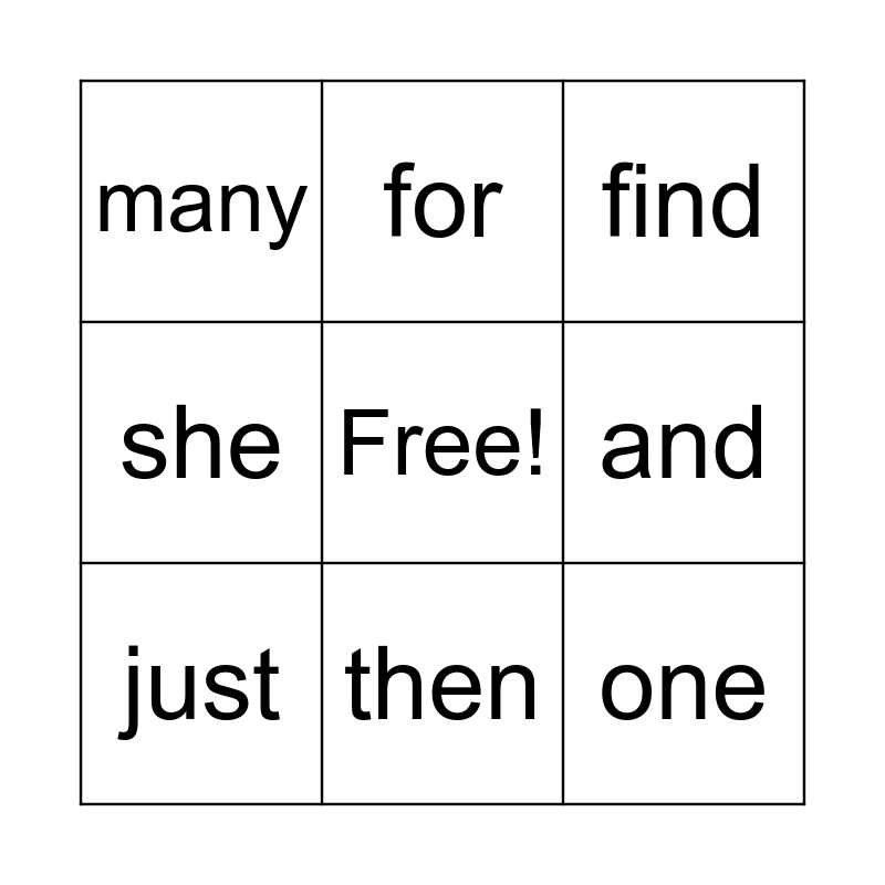 This bingo card has a free space and 8 words: and, find, for, just, many, one, she and then.