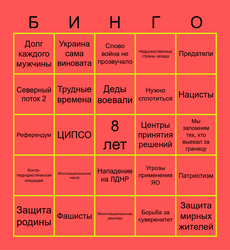 This bingo card has a free space and 24 words: Многонациональный народ, Фашисты, Деды воевали, Защита родины, Предатели, Долг каждого мужчины, Северный поток 2, Украина сама виновата, Центры принятия решений, Нападение на ЛДНР, Нужно сплотиться, Референдум, Угрозы применения ЯО, Патриотизм, Трудные времена, Борьба за суверенитет, Мы запомним тех, кто выехал за границу, Слово война не прозвучало, Нацисты, ЦИПСО, Защита мирных жителей, Контр-террористическая операция, Недружественные страны запада and Многонациональная держава.