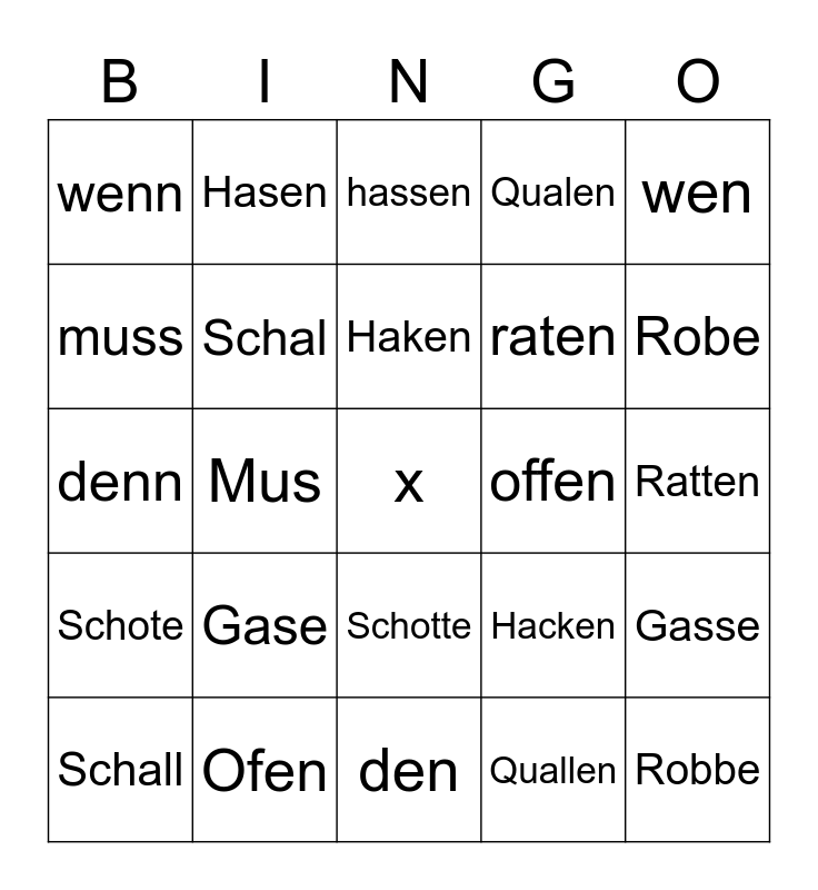 This bingo card has a free space and 24 words: Gase, Ofen, Haken, Schall, wen, wenn, muss, Hasen, offen, Schotte, raten, denn, Hacken, Gasse, Schal, Quallen, Ratten, hassen, Robe, Mus, Robbe, Schote, Qualen and den.
