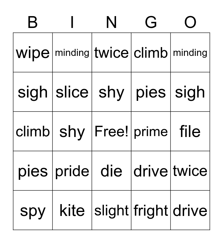 ⚠ This card has duplicate items: spy (2), shy (2), twice (2), drive (2), sigh (2), die (2), pies (2), minding (2), climb (2)