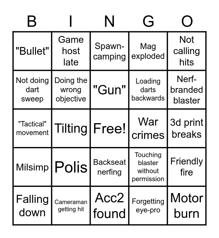 This bingo card has a free space and 24 words: Falling down, Polis, "Gun", Forgetting eye-pro, Not calling hits, "Bullet", Game host late, Spawn-camping, War crimes, 3d print breaks, "Tactical" movement, Doing the wrong objective, Touching blaster without permission, Friendly fire, Not doing dart sweep, Cameraman getting hit, Acc2 found, Mag exploded, Nerf-branded blaster, Milsimp, Tilting, Backseat nerfing, Loading darts backwards and Motor burn.