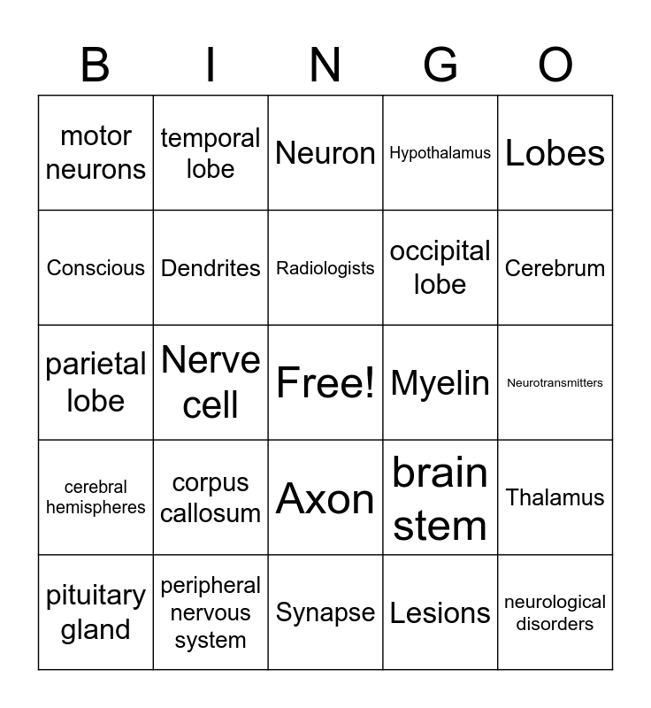 This bingo card has a free space and 30 words: peripheral nervous system, central nervous system, Nerve cell, sensory neurons, motor neurons, Neuron, Dendrites, Axon, Myelin, Synapse, Neurotransmitters, neurological disorders, Lesions, Tumors, Cerebrum, Cerebellum, brain stem, cerebral hemispheres, corpus callosum, Lobes, parietal lobe, frontal lobe, temporal lobe, occipital lobe, Conscious, Hypothalamus, Thalamus, pituitary gland, Radiologists and Neurologists.