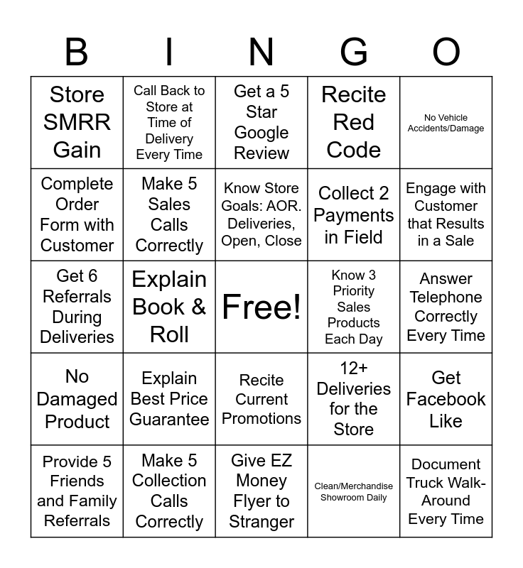 This bingo card has a free space and 41 words: Store Sells 2 VIP Clubs, Get 6 Referrals During Deliveries, 25 Door Hangers, Make 5 Sales Calls Correctly, Make 5 Collection Calls Correctly, Recite Current Promotions, Know Store Goals: AOR. Deliveries, Open, Close, Greet Customers Correctly Every Time, No Vehicle Accidents/Damage, No Damaged Product, Explain Book & Roll, Recite Red Code, Document Truck Walk-Around Every Time, Answer Telephone Correctly Every Time, Know 3 Priority Sales Products Each Day, Explain Best Price Guarantee, 10 Deliveries for the Store, Store SMRR Gain, 1 or More EZ Money Referrals, Get a 5 Star Google Review, Get Facebook Like, 50 Apartment Flyers/Hangers, Give EZ Money Flyer to Stranger, Collect 2 Payments in Field, Help with Top 20 List, Clear a 15+ Account, Clean/Merchandise Showroom Daily, Uload Vendor Truck at Warehouse, Engage with Customer that Results in a Sale, Wear Logo Shirt and Name Tag Every Day, Exhibit Positive Attitude and Smile Daily, Call Back to Store at Time of Delivery Every Time, Provide 5 Friends and Family Referrals, On Time to Work Every Day, 12+ Deliveries for the Store, Complete Order Form with Customer, Recite F&B’s on 5 Products, Recite Current Promotions, 50 Door Hangers, Recite 3 Benefits of VIP Club and Help with a Store Sales Event.
