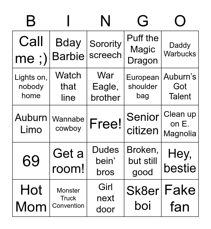 This bingo card has a free space and 24 words: Get a room!, Monster Truck Convention, War Eagle, brother, Hot Mom, Daddy Warbucks, Call me ;), Lights on, nobody home, Bday Barbie, Senior citizen, Dudes bein’ bros, European shoulder bag, Auburn Limo, Broken, but still good, Hey, bestie, Watch that line, Sk8er boi, Clean up on E. Magnolia, Sorority screech, Auburn’s Got Talent, Wannabe cowboy, Fake fan, 69, Puff the Magic Dragon and Girl next door.