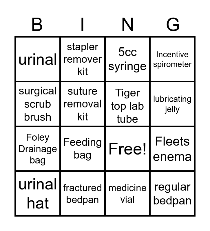This bingo card has 22 words: fractured bedpan, Dual-head Stethoscope, stapler remover kit, Colostomy bag, suture removal kit, Tiger top lab tube, urinal, 5cc syringe, Free!, regular bedpan, Foley Drainage bag, Incentive spirometer, betadine swab sticks, hemostats, medicine vial, cleansing enema kit, Fleets enema, urinal hat, Feeding bag, surgical scrub brush, lubricating jelly and biohazard bag.