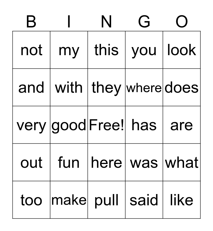 This bingo card has a free space and 24 words: fun, make, they, too, look, not, and, my, has, here, where, very, was, what, with, said, are, this, does, good, like, out, you and pull.
