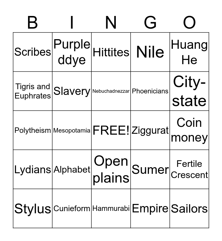 This bingo card has a free space and 25 words: Alphabet, Hammurabi, Nebuchadnezzar, Stylus, Huang He, Scribes, Tigris and Euphrates, Purple ddye, Ziggurat, Open plains, Phoenicians, Polytheism, Sumer, Fertile Crescent, Slavery, Babylon, Coin money, Hittites, City-state, Mesopotamia, Sailors, Cunieform, Lydians, Nile and Empire.