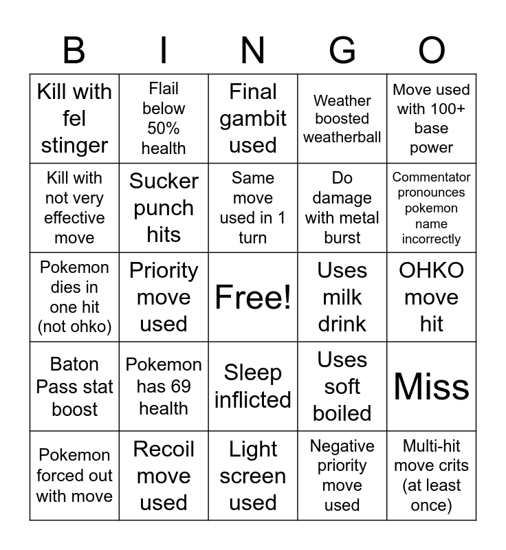 This bingo card has a free space and 89 words: Paralysis inflicted, Burn inflicted, Sleep inflicted, Poison/Toxic inflicted, Confusion inflicted, Fully Paralyzed, Fully paralyzed 2 turns in a row, Flinch, Hit self in confusion, Critical hit, Grass type pokemon, Normal type pokemon, Miss, OHKO move hit, OHKO move used, Same move used in 1 turn, Multi-hit move hits 5 times, Multi-hit move hits 4 times, Multi-hit move hits 3 times, Multi-hit move hits 2 times, Weather effect, Reflect used, Light screen used, Same Pokemon on both sides, Pokemon dies in one hit (not ohko), Recoil move used, Pokemon dies to poison, Trapping move used, Switching move used, Super fang used, Weather boosted weatherball, Priority move used, Kill with priority move, Kill with fel stinger, Move has no effect, Final gambit used, Kill with not very effective move, Commentator gets hype, Commentator pronounces pokemon name incorrectly, Pokemon forced out with move, Baton Pass stat boost, Omniboost, Switch into super effective move, Player surrenders, Uses soft boiled, Uses milk drink, Uses slack off, Metronome used, Shiny Pokemon, Flail below 50% health, Lower opponent's accuracy, Lower opponent's attack, Lower opponent’s defense, Lower opponent’s speed, Lower opponent’s special attack, Lower opponent’s special defense, Raise own accuracy, Raise own attack, Raise own defense, Raise own speed, Raise own special attack, Raise own special defense, Turn 2 wake up, Turn 3 wake up, Unthaw same turn, Both players miss on same turn, Both players crit on same turn, 2 misses in a row, 2 flinches in a row, Pokemon has 69 health, Multi-hit move crits (at least once), Flat damage move crits, Kill using destiny bond, Do damage with metal burst, Sucker punch hits, Negative priority move used, Trick room used, Health drain move used, Uses tailwind, Lead matchups share a type, Move used with 100+ base power, 3 turns or more frozen, Leech seed used, Take less than 10 damage, Super effective STAB move, Heal back to full health, Freeze dry hits water type, 4x effective move hits and 4x resisted move.