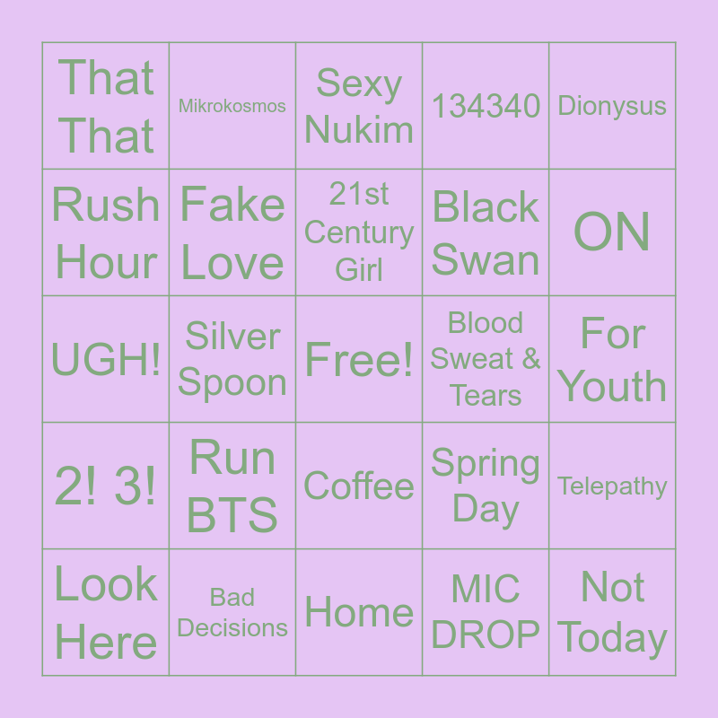 This bingo card has a free space and 24 words: Look Here, Run BTS, 21st Century Girl, MIC DROP, Dionysus, That That, Mikrokosmos, Sexy Nukim, Blood Sweat & Tears, For Youth, UGH!, Fake Love, Spring Day, Telepathy, Rush Hour, Bad Decisions, Home, 134340, ON, 2! 3!, Silver Spoon, Coffee, Black Swan and Not Today.
