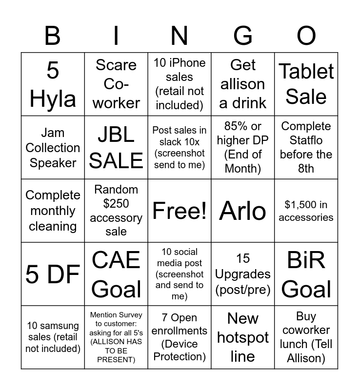 This bingo card has a free space and 24 words: CAE Goal, Mention Survey to customer: asking for all 5's (ALLISON HAS TO BE PRESENT), Post sales in slack 10x (screenshot send to me), 10 samsung sales (retail not included), Tablet Sale, 5 Hyla, Jam Collection Speaker, Scare Co-worker, Arlo, 10 social media post (screenshot and send to me), 85% or higher DP (End of Month), Complete monthly cleaning, 15 Upgrades (post/pre), BiR Goal, JBL SALE, New hotspot line, $1,500 in accessories, 10 iPhone sales (retail not included), Complete Statflo before the 8th, Random $250 accessory sale, Buy coworker lunch (Tell Allison), 5 DF, Get allison a drink and 7 Open enrollments (Device Protection).