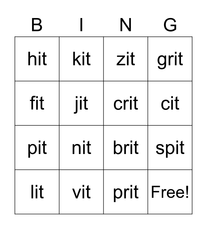 This bingo card has 23 words: Free!, bit, cit, dit, fit, hit, jit, kit, lit, mit, nit, pit, rit, sit, vit, wit, zit, brit, crit, spit, grit, prit and trit.