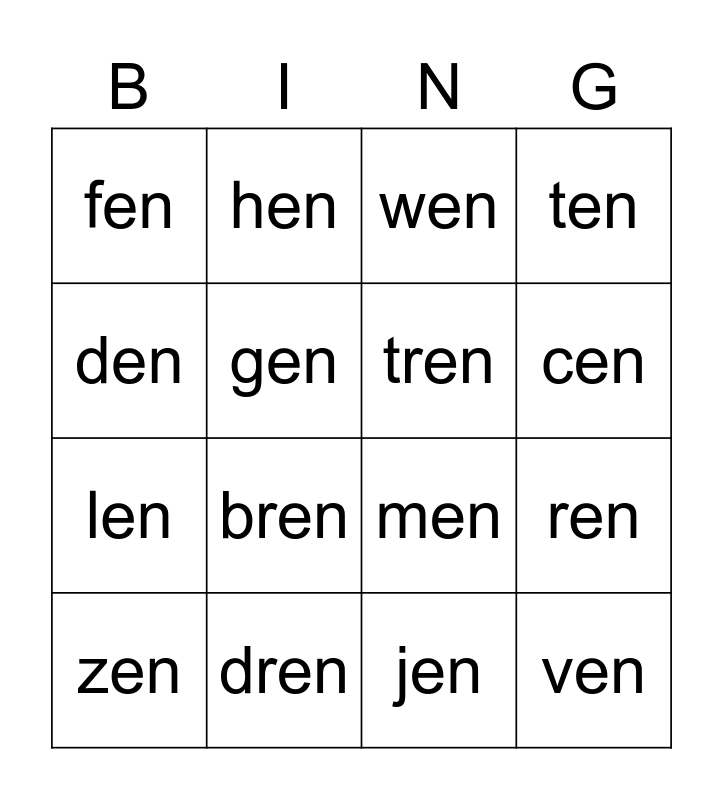 This bingo card has 26 words: Free!, ben, cen, chen, den, fen, gen, hen, jen, ken, len, men, nen, pen, ren, sen, ten, ven, wen, zen, bren, cren, dren, pren, tren and shen.