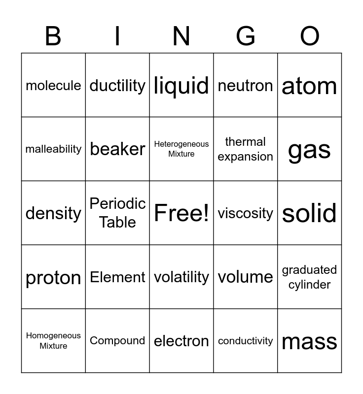This bingo card has a free space and 24 words: Element, Compound, Heterogeneous Mixture, Homogeneous Mixture, atom, molecule, malleability, ductility, viscosity, volatility, thermal expansion, density, volume, graduated cylinder, beaker, conductivity, solid, liquid, gas, Periodic Table, mass, proton, neutron and electron.