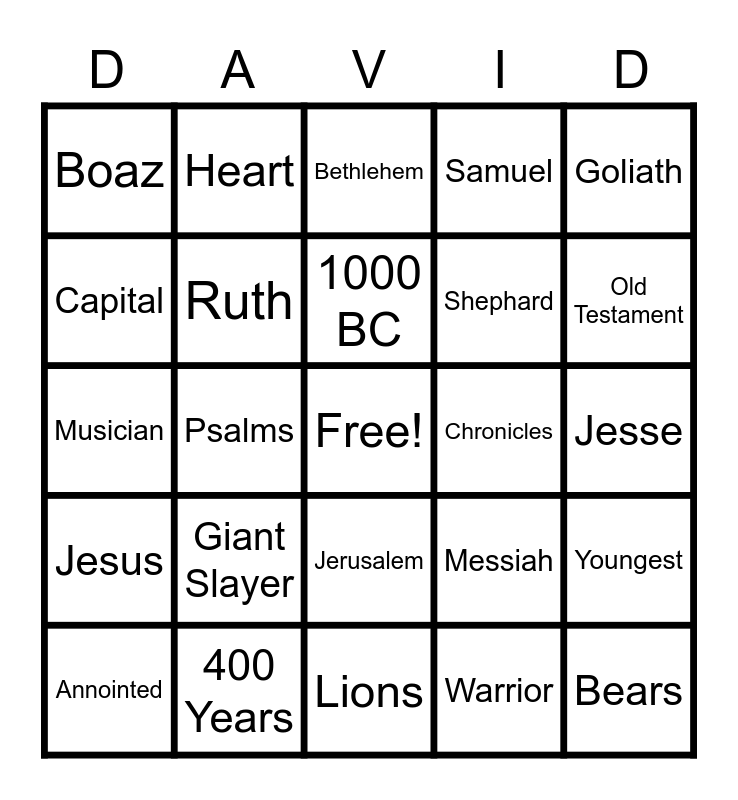 This bingo card has a free space and 24 words: Giant Slayer, 400 Years, 1000 BC, Annointed, Goliath, Boaz, Capital, Heart, Chronicles, Jerusalem, Shephard, Musician, Messiah, Youngest, Ruth, Warrior, Jesse, Bethlehem, Old Testament, Psalms, Bears, Jesus, Samuel and Lions.