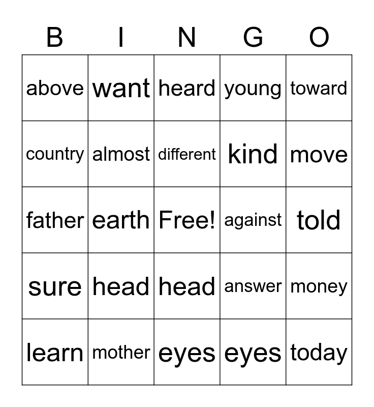 This bingo card has a free space and 24 words: head, mother, different, learn, toward, above, country, want, against, head, kind, father, answer, money, almost, eyes, told, heard, move, earth, today, sure, young and eyes.