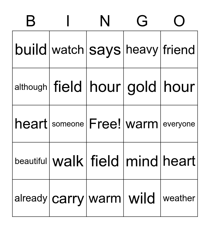 This bingo card has a free space and 24 words: walk, carry, hour, already, friend, build, although, watch, warm, field, gold, heart, mind, heart, field, wild, everyone, says, hour, someone, weather, beautiful, heavy and warm.