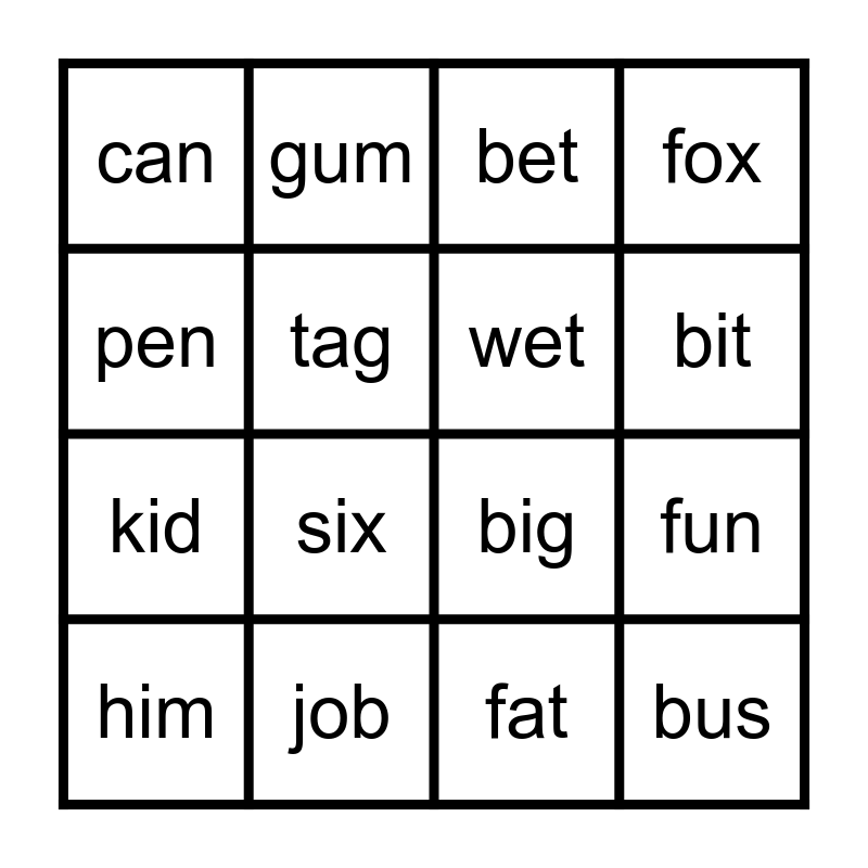 This bingo card has 16 words: job, fun, bet, can, kid, gum, big, fat, pen, tag, him, fox, six, bit, wet and bus.