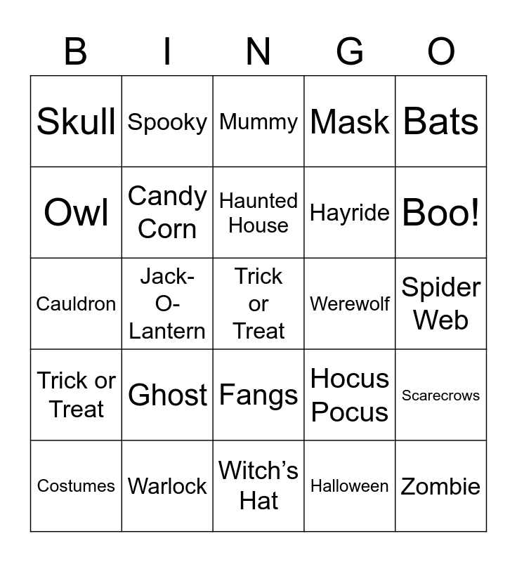 This bingo card has a free space and 32 words: Halloween, Witch, Jack-O-Lantern, Pumpkin, Trick or Treat, Candy Corn, Bats, Scarecrows, Spooky, Broomstick, Haunted House, Mummy, Scary, Monster, Werewolf, Vampire, Costumes, Cauldron, Fangs, Ghost, Hocus Pocus, Skeleton, Spider Web, Warlock, Zombie, Mask, Hayride, Owl, Skull, Witch’s Hat, Frankenstein and Boo!.