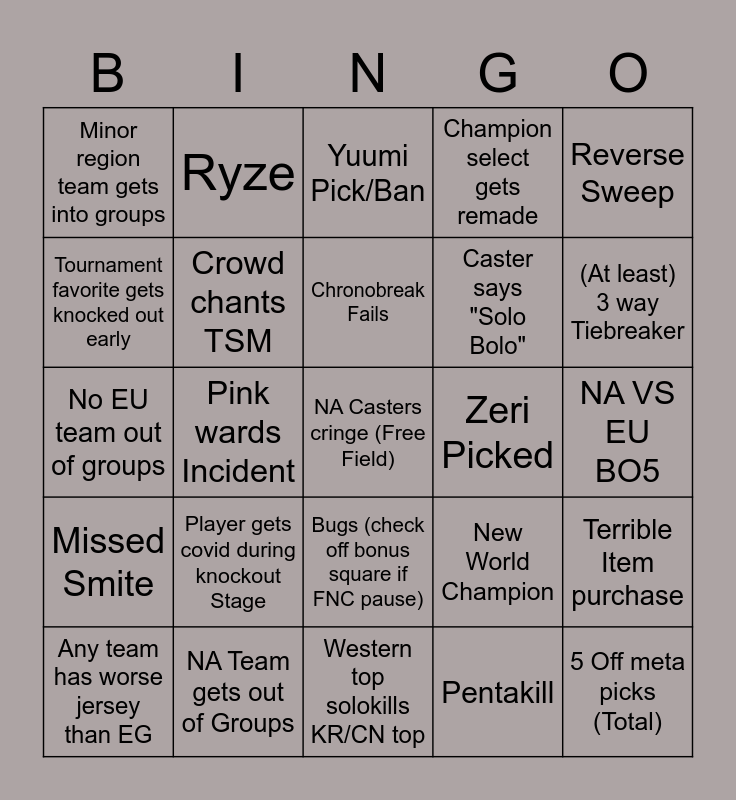 This bingo card has a free space and 24 words: Player gets covid during knockout Stage, NA Team gets out of Groups, Chronobreak Fails, Any team has worse jersey than EG, Reverse Sweep, Minor region team gets into groups, Tournament favorite gets knocked out early, Ryze, Zeri Picked, Bugs (check off bonus square if FNC pause), Caster says "Solo Bolo", No EU team out of groups, New World Champion, Terrible Item purchase, Crowd chants TSM, Pentakill, NA VS EU BO5, Yuumi Pick/Ban, (At least) 3 way Tiebreaker, Pink wards Incident, 5 Off meta picks (Total), Missed Smite, Champion select gets remade and Western top solokills KR/CN top.