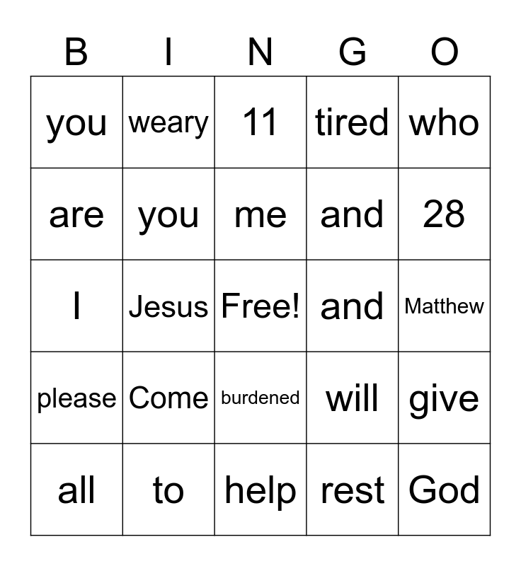 This bingo card has a free space and 24 words: Come, to, me, all, who, you, are, weary, and, burdened, and, I, will, give, you, rest, Matthew, 11, 28, Jesus, God, please, tired and help.