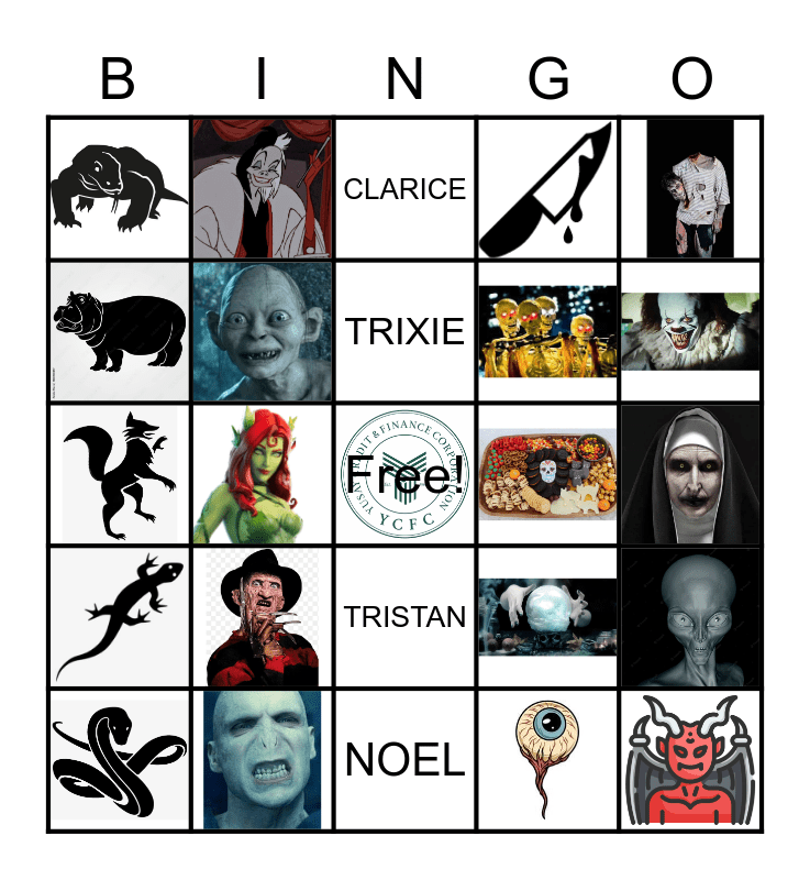 This bingo card has 20 images, a free space and 4 words: TRIXIE, CLARICE, NOEL and TRISTAN.