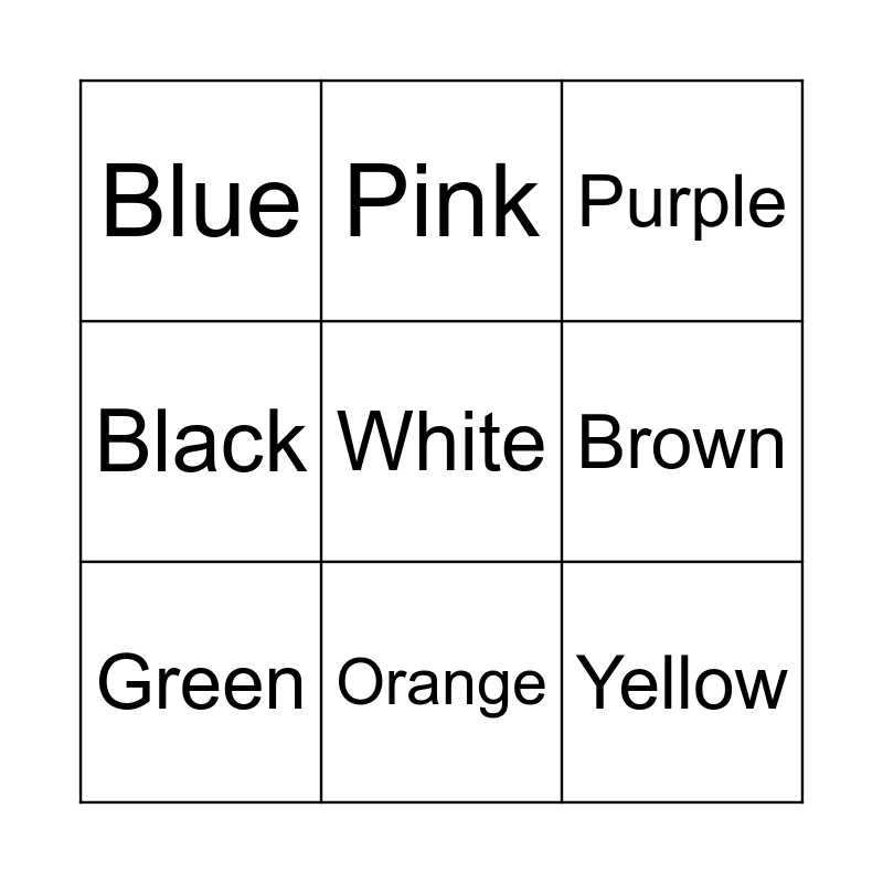 This bingo card has 9 words: Green, Purple, Pink, Black, Blue, Brown, White, Yellow and Orange.