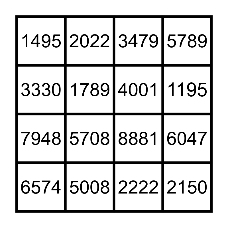 This bingo card has 24 words: 888, 4020, 1195, 1254, 3330, 1495, 1789, 2022, 5008, 6070, 7948, 8881, 9992, 3050, 4001, 5554, 2222, 3479, 5708, 6047, 6574, 2150, 5789 and 1107.