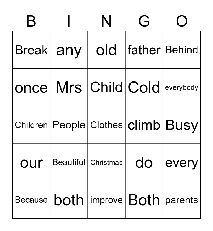 This bingo card has a free space and 24 words: Beautiful, both, Child, Because, Behind, Break, once, any, climb, Christmas, Cold, Children, do, every, Mrs, Both, Busy, old, everybody, People, parents, our, father and improve.