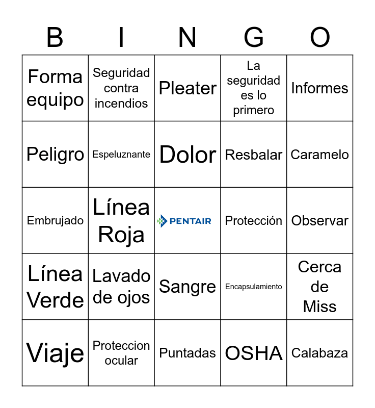 This bingo card has a free space and 55 words: Testigo, Viaje, Adiestramiento, Forma equipo, Puntadas, Esguince, Espeluznante, Fuente, Resbalar, Objetos afilados, La seguridad es lo primero, Causa raíz, Riesgo, Recompensa, Reposo, Resoluciones, Informes, Línea Roja, Línea Púrpura, Calabaza, Protección, PPE, Encapsulamiento, Pleater, Línea Rosa, Dolor, OSHA, Neblina de aceite, Observar, Cerca de Miss, Manipulación de materiales, Seguridad de la máquina, Herida, Incidentes, Peligro, Embrujado, Víspera de Todos los Santos, Línea Verde, Carne, Primeros auxilios, Seguridad contra incendios, Filtro, FDA, Fatal, Lavado de ojos, Proteccion ocular, Ergonomía, Emergencia, Borrar ruta, Caramelo, Boxeo, Abuchear, Línea Azul, Sangre and Línea Negra.