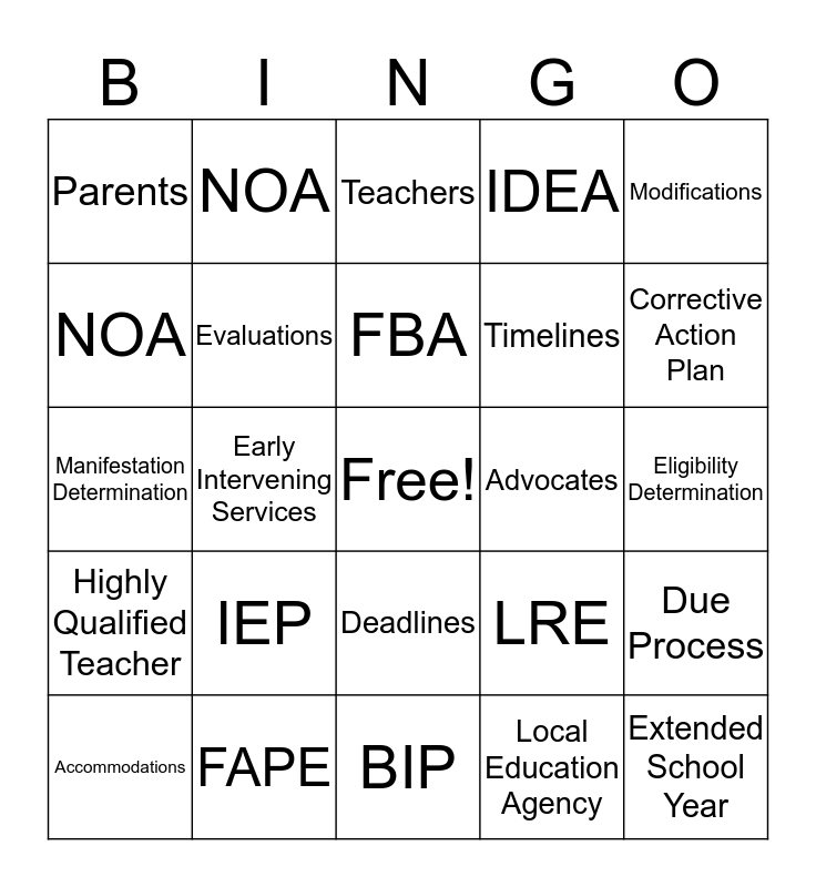This bingo card has a free space and 25 words: IEP, BIP, FBA, Accommodations, Modifications, Parents, NOA, NOA, Advocates, Deadlines, Timelines, Manifestation Determination, LRE, Due Process, Evaluations, Procedural Safeguards, Eligibility Determination, Teachers, Corrective Action Plan, Early Intervening Services, Extended School Year, FAPE, Highly Qualified Teacher, IDEA and Local Education Agency.
