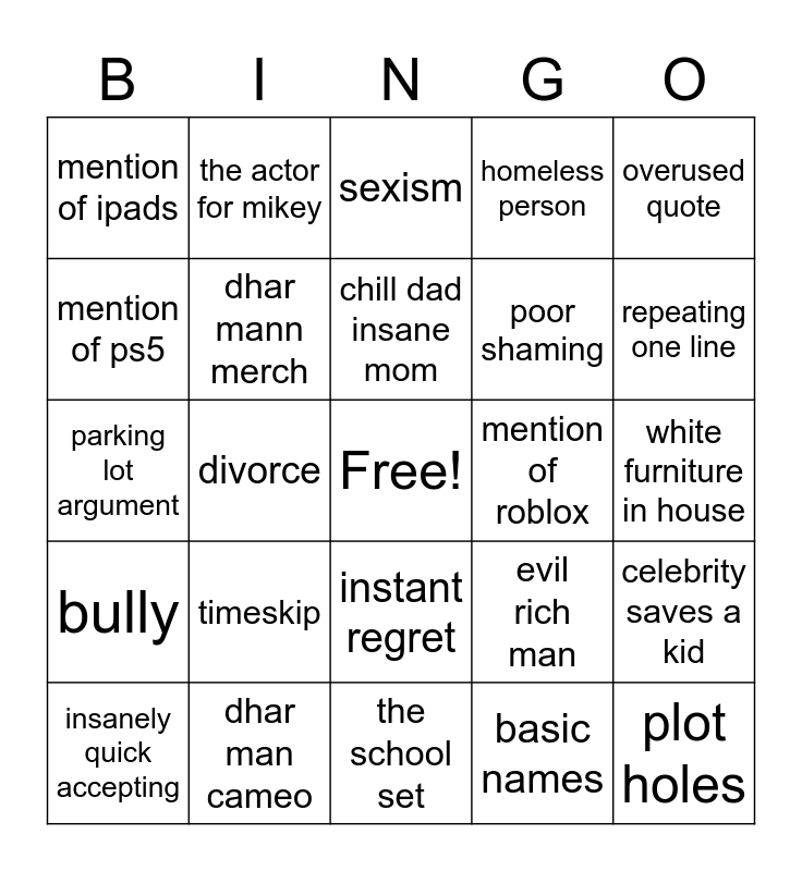 This bingo card has a free space and 25 words: timeskip, the school set, chill dad insane mom, insanely quick accepting, overused quote, mention of ipads, mention of ps5, the actor for mikey, mention of roblox, instant regret, poor shaming, parking lot argument, evil rich man, celebrity saves a kid, dhar mann merch, group of mean girls, white furniture in house, sexism, repeating one line, divorce, plot holes, dhar man cameo, bully, homeless person and basic names.