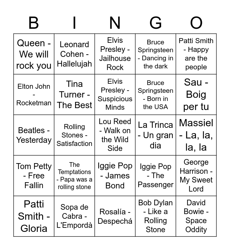 This bingo card has 33 words: David Bowie - Space Oddity, David Bowie - Heroes, Rolling Stones - Satisfaction, Rolling Stones - Brown sugar, Tom Petty - Free Fallin, Tina Turner - The Best, Patti Smith - Happy are the people, Patti Smith - Gloria, Leonard Cohen - Hallelujah, Janis Joplin - Piece of my heart, Elvis Presley - Suspicious Minds, Elvis Presley - Jailhouse Rock, Aretha Franklin - Respect, Lluis Llach - Pais petit, La Trinca - Un gran dia, Sau - Boig per tu, Sopa de Cabra - L'Empordà, Beatles - Yesterday, The Temptations - Papa was a rolling stone, Iggie Pop - The Passenger, Iggie Pop - James Bond, Queen - Bohemian Rapsody, Queen - We will rock you, Massiel - La, la, la, la, Rosalía - Despechá, Lou Reed - Walk on the Wild Side, Bruce Springsteen - Dancing in the dark, Bruce Springsteen - Born in the USA, Elton John - Rocketman, George Harrison - My Sweet Lord, The Animals - The House of the Rising House, Bob Dylan - Like a Rolling Stone and Cat Stevens - Wild World.