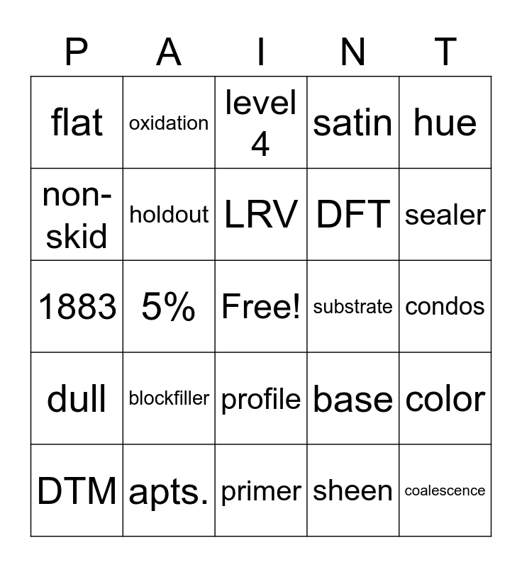 This bingo card has a free space and 39 words: Multi-Family, kitchen, surface prep, holdout, DTM, profile, LRV, Semi-gloss, hue, dull, 5%, satin, coalescence, condos, substrate, blockfiller, clean, flat, vehicle, base, non-skid, primer, DFT, sealer, components, dry, pigments, binder, applications, oxidation, value, drywall, level 4, apts., sheen, gloss, color, 1883 and 80%.