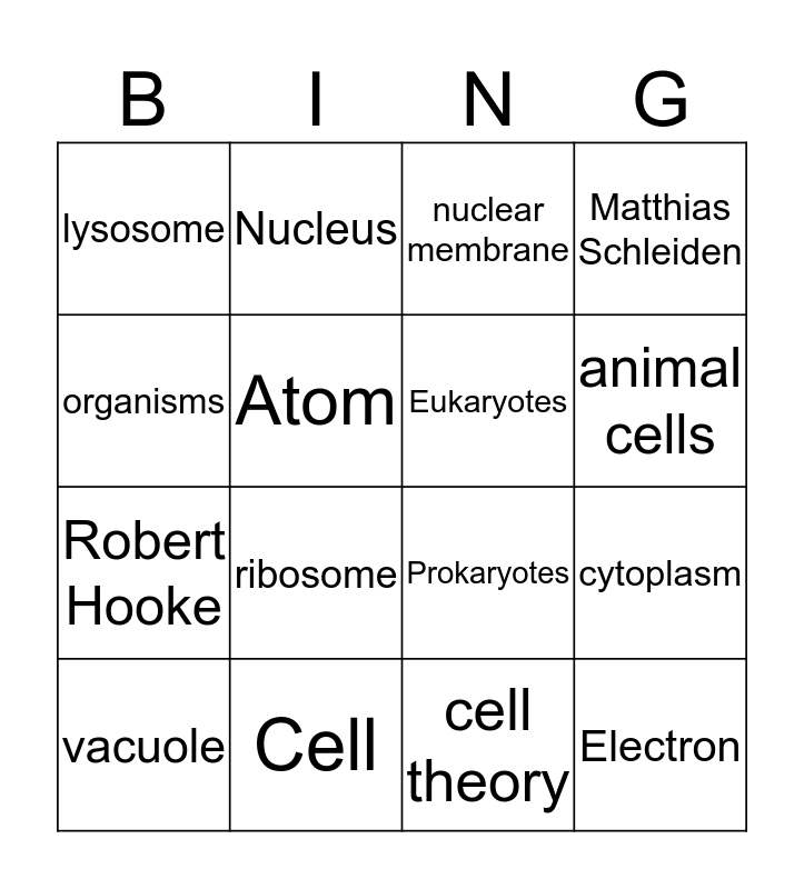 This bingo card has 16 words: Cell, cytoplasm, nuclear membrane, lysosome, Robert Hooke, Nucleus, Prokaryotes, cell theory, organisms, Atom, vacuole, Matthias Schleiden, ribosome, animal cells, Eukaryotes and Electron.