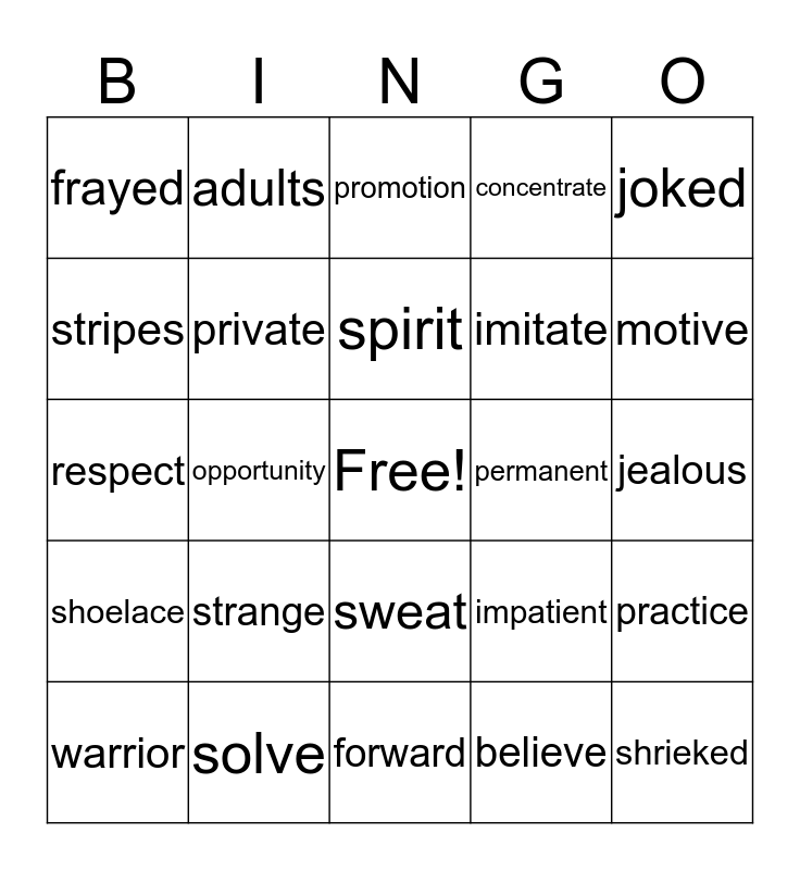 This bingo card has a free space and 24 words: strange, solve, spirit, warrior, joked, frayed, stripes, adults, permanent, sweat, imitate, respect, impatient, practice, private, believe, jealous, promotion, motive, opportunity, shrieked, shoelace, concentrate and forward.