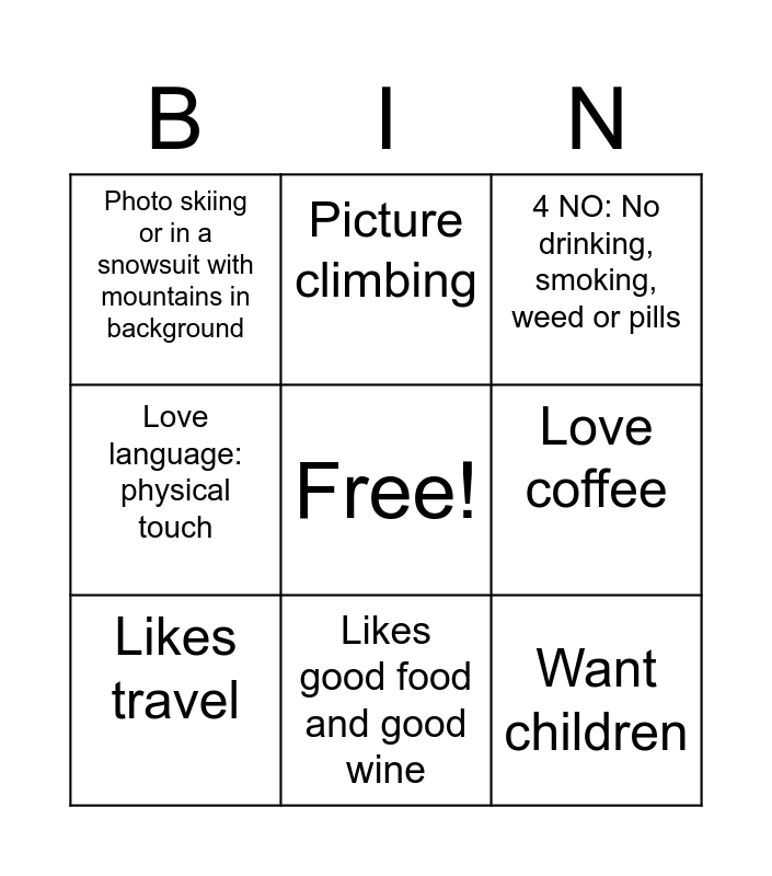 This bingo card has a free space and 8 words: Love coffee, 4 NO: No drinking, smoking, weed or pills, Picture climbing, Likes travel, Photo skiing or in a snowsuit with mountains in background, Want children, Love language: physical touch and Likes good food and good wine.