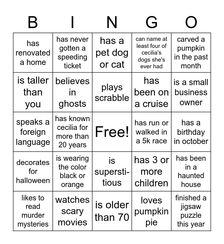 This bingo card has a free space and 24 words: is wearing the color black or orange, watches scary movies, plays scrabble, likes to read murder mysteries, carved a pumpkin in the past month, has renovated a home, is taller than you, has never gotten a speeding ticket, has run or walked in a 5k race, is supersti-tious, has been on a cruise, speaks a foreign language, has 3 or more children, has been in a haunted house, believes in ghosts, loves pumpkin pie, has a birthday in october, has a pet dog or cat, is a small business owner, has known cecilia for more than 20 years, finished a jigsaw puzzle this year, decorates for halloween, can name at least four of cecilia's dogs she's ever had and is older than 70.