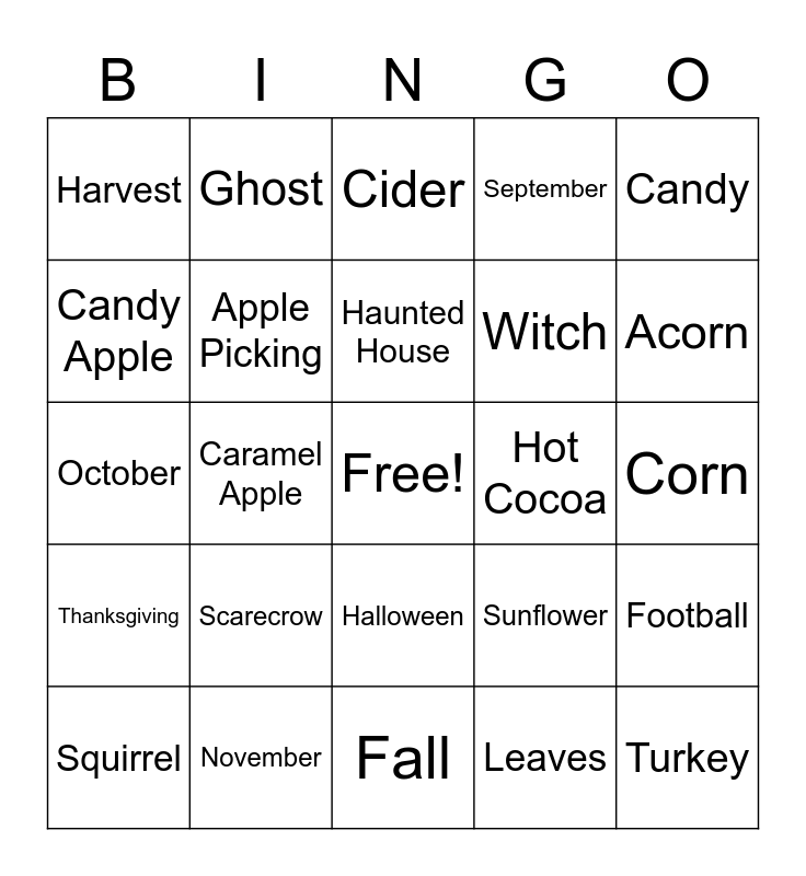 This bingo card has a free space and 31 words: Fall, Autumn, Caramel Apple, Corn Maze, Harvest, Cider, Apple Picking, Sunflower, Hot Cocoa, Leaves, Corn, Turkey, Pumpkin, Squash, Acorn, Full Moon, Football, Scarecrow, Thanksgiving, Halloween, Candy, Festival, Squirrel, Ghost, Witch, Candy Apple, September, October, November, Haunted House and Pilgrims.