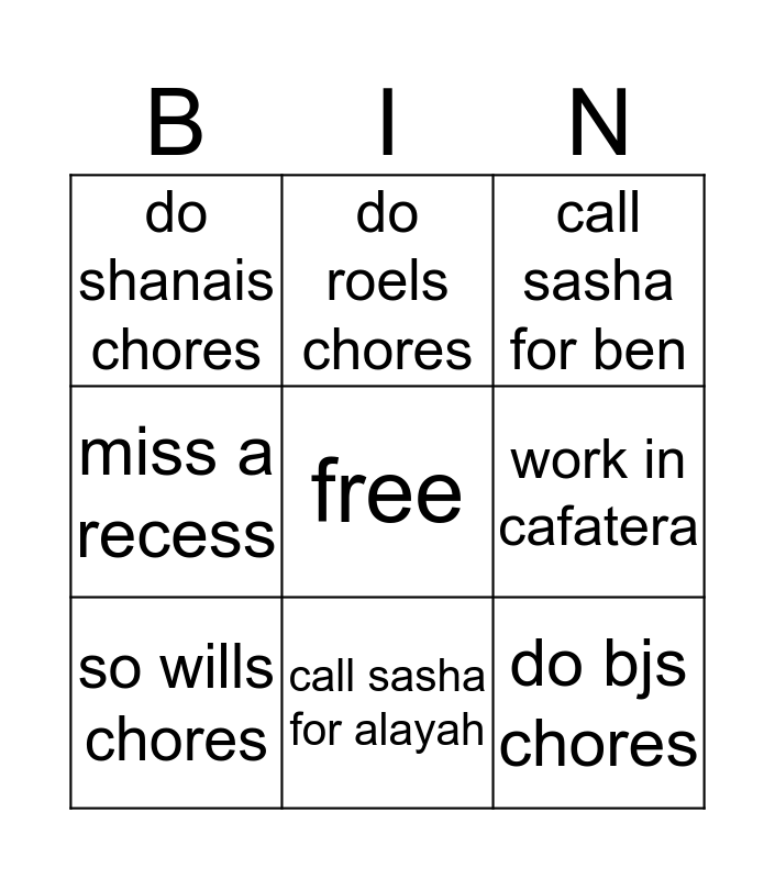 This bingo card has a free space and 8 words: work in cafatera, call sasha for ben, do roels chores, so wills chores, do shanais chores, do bjs chores, miss a recess and call sasha for alayah.